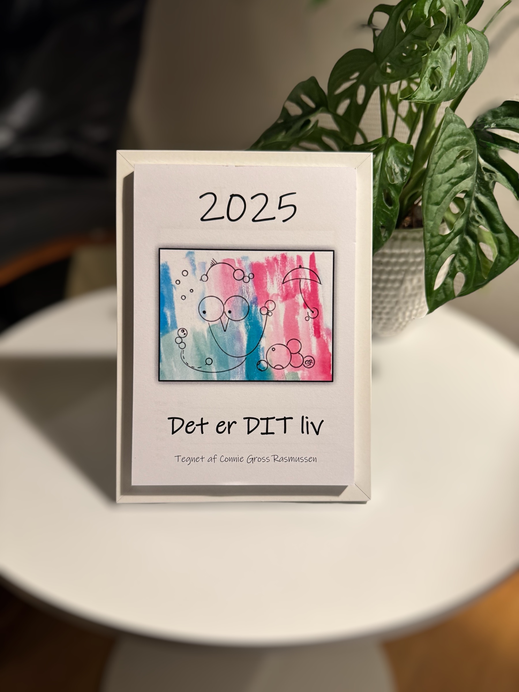 Kalender i hvid ramme – 13,5 x 18,5 cm.