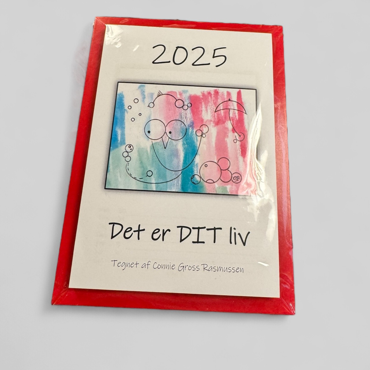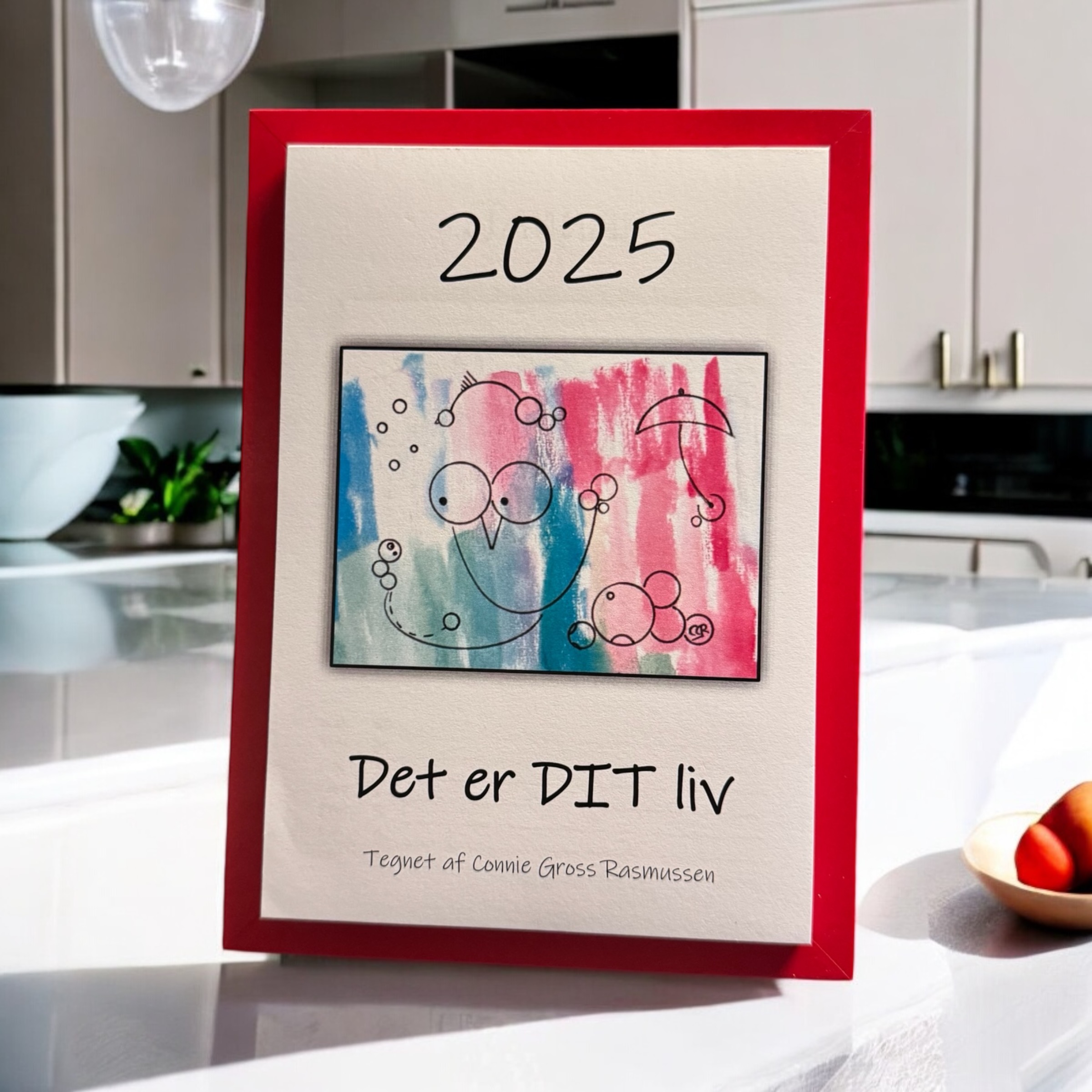 Kalender i rød ramme – 14 x 19 cm.