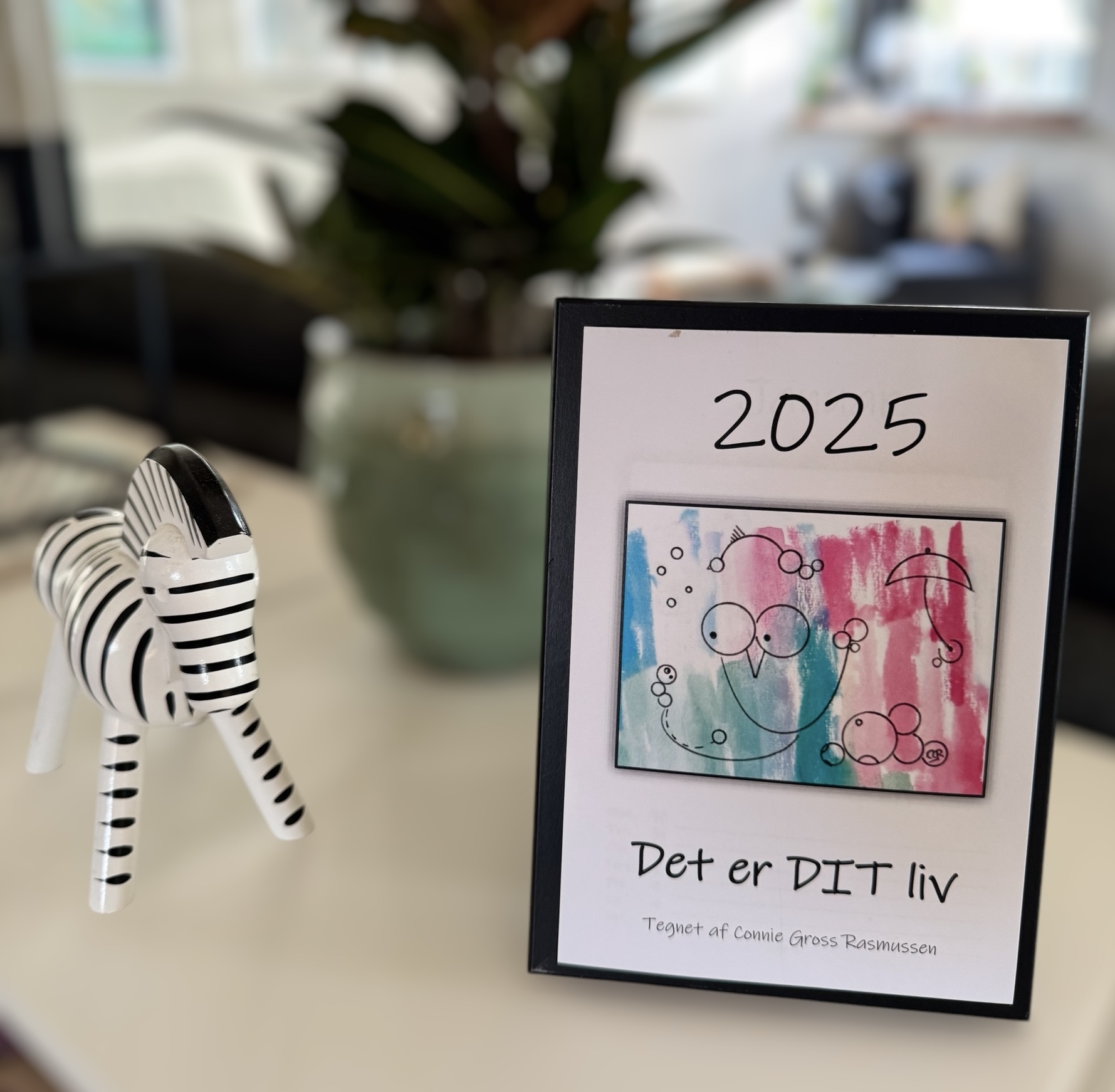Kalender i sort ramme med afrundede kanter – 13 x 18 cm.