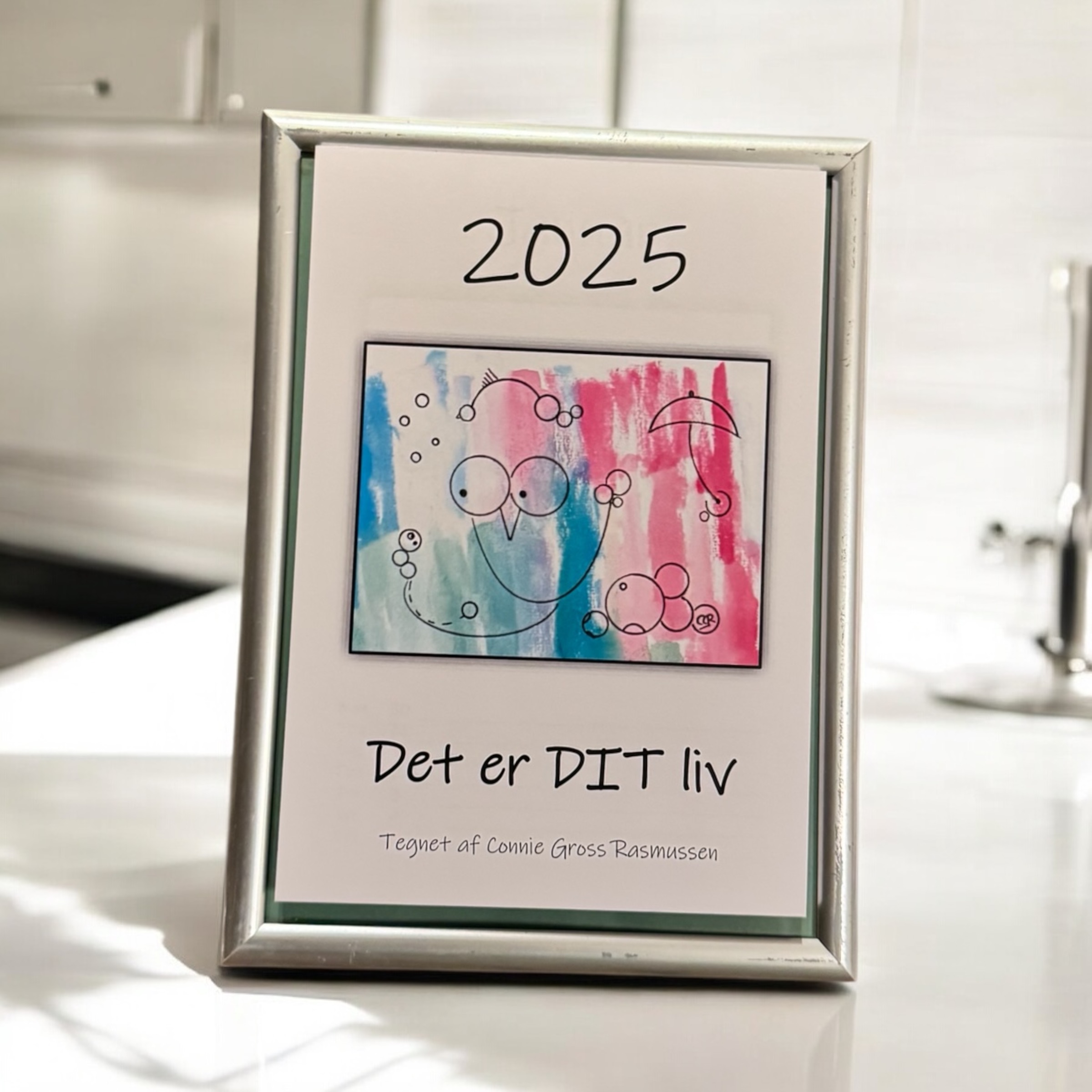 Kalender i metal ramme – på grøn baggrund – 14 x 19 cm.